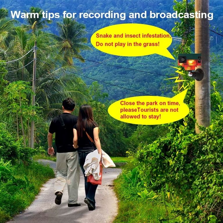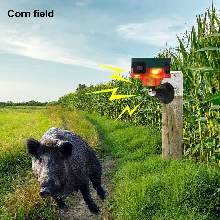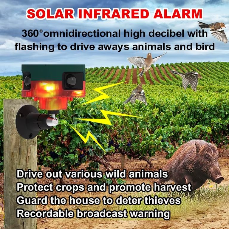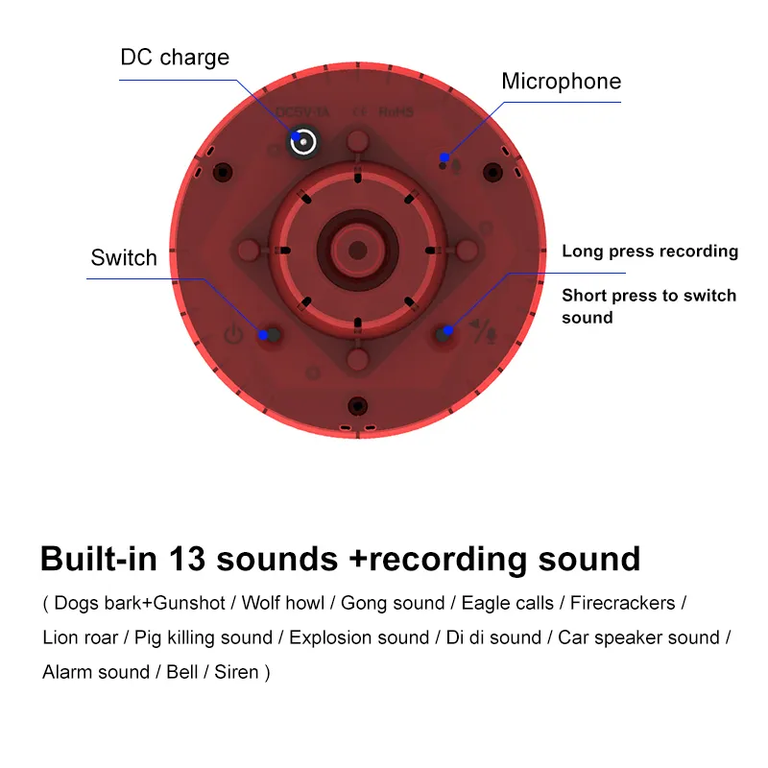 При срабатывании датчика движения отпугиватель издает любые из 13 записанных звуков( лай собак, крик хищных птиц, сирена, вой диких животных, гонг, колокол и т.д.) , которые были выставлены пользователем. Также можно дополнительно записать свои звуковые эффекты.Сигналы сопровождаются яркими красными вспышками шести светодиодных ламп.