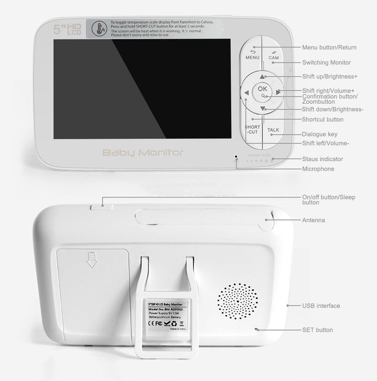Видеоняня «Baby Monitor 5 inch HD» станет незаменимой помощницей, существенно облегчив хлопоты заботливых родителей. Значительно сократится количество посещений детской во время сна и днём, и ночью. Видеоняня обеспечит круглосуточный бесперебойный контроль. Стабильная и надёжная связь, расширенная функциональность в совокупности с высоким качеством изделия: всё это позволяет назвать эту видеоняню одним из наиболее удобных и безопасных устройств для удалённого присмотра за крохой.