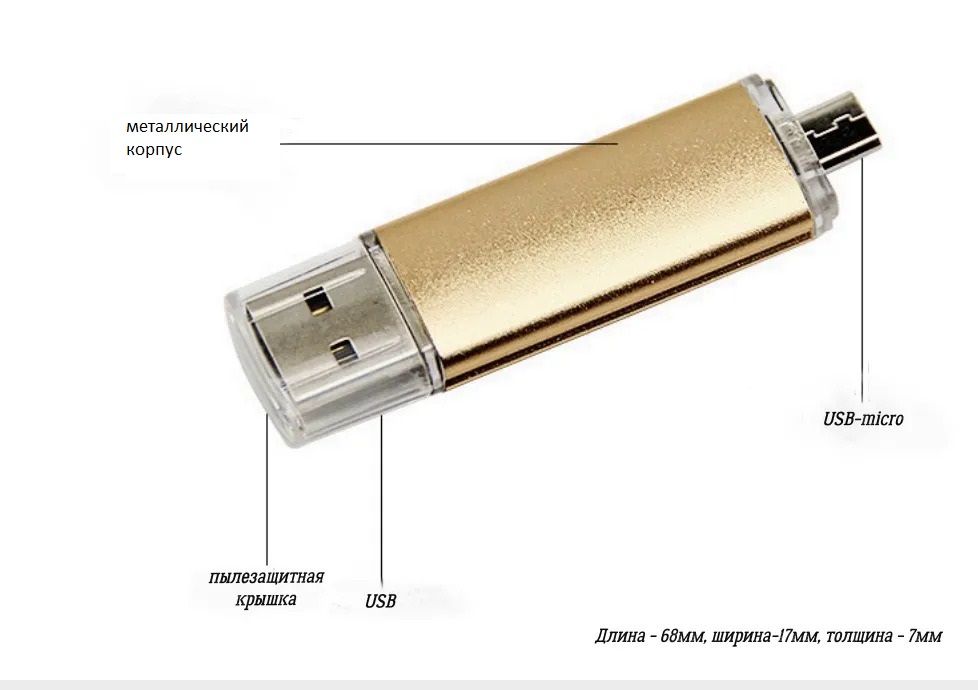 3. Флеш-накопитель на 16 ГБ с двумя разъемами USB и MicroUSB, который можно подключать к смартфону и ПК.