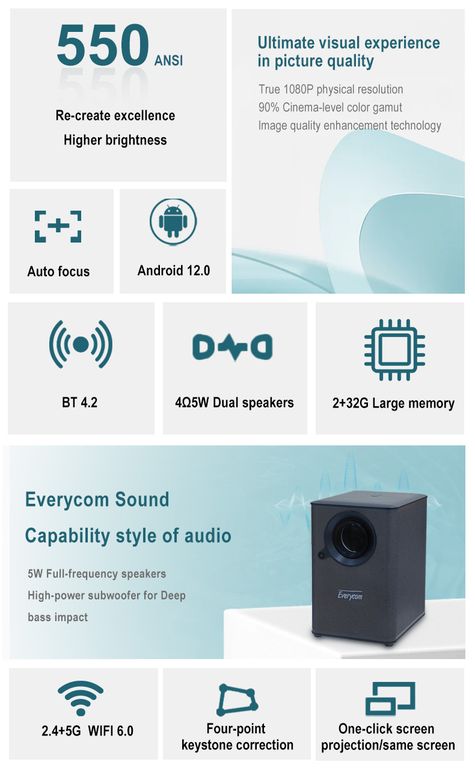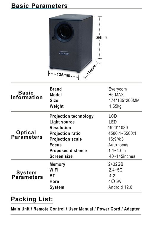 Этот проектор исполнен в красивом темно-сером цвете, имеет полностью закрытую оптическую систему, память 2+32 Gb, операционную систему Android 12.0, и автоматический фокус.