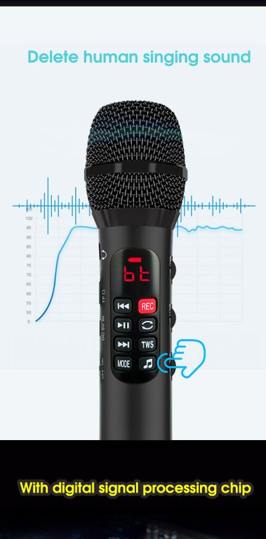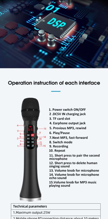 ПРОФЕССИОНАЛЬНЫЙ КАРАОКЕ-МИКРОФОН L-1038DSP 25W -- модель, в которой производитель увеличил мощность динамика до 25W, при этом оставив слот для TF card и функцию записи голоса.