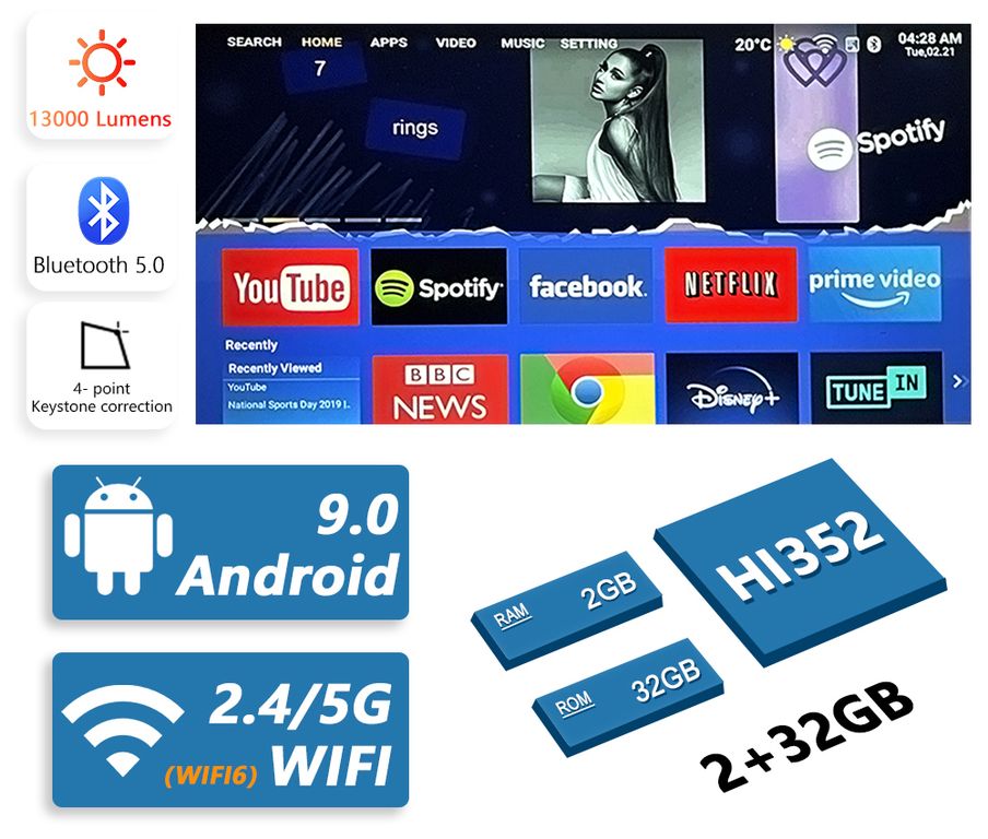 Данный проектор имеет отличные параметры: операционная система Android 9.0, мощный процессор HiSilicon His 352 от Huawei с поддержкой Wi-Fi 6 (2.4/5Ггц), Bluetooth 5.0, родное разрешение 1920:1080p с поддержкой 4K.