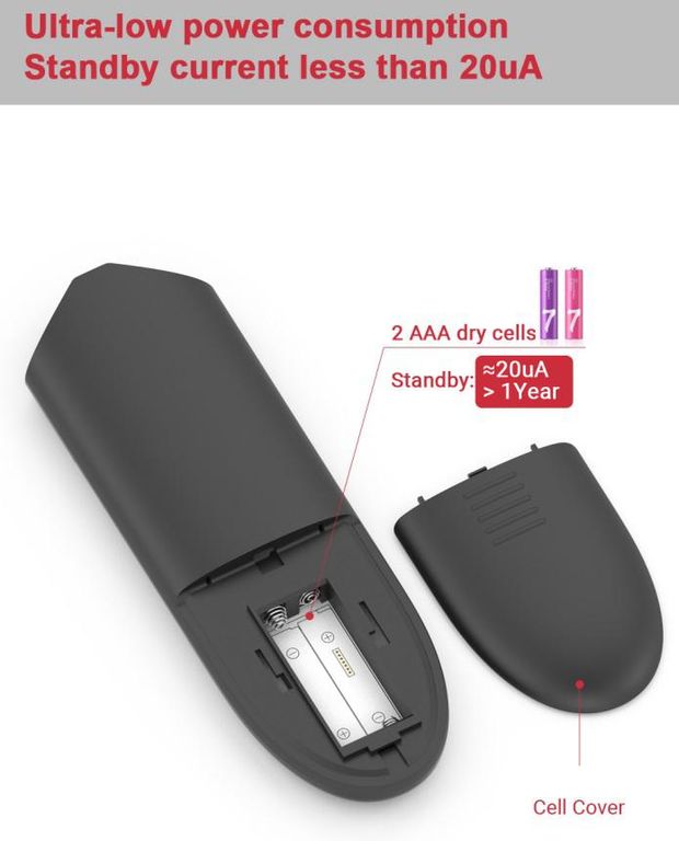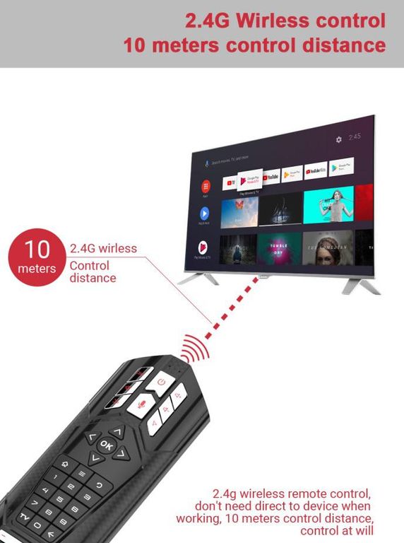 Рабочее расстояние управления до 10 м. Предназначен для управления ТВ приставками, Android TV боксами, телевизорами и проекторами, медиаплеерами, PC, MAC и другими устройствами. Пульт имеет 32 кнопки управления, за исключением кнопки "TV" остальные кнопки - обучаемые. Кнопка “TV” переключает из режима радиосвязи 2.4 Гг в режим “ИК”, в котором программируются нужные кнопки.