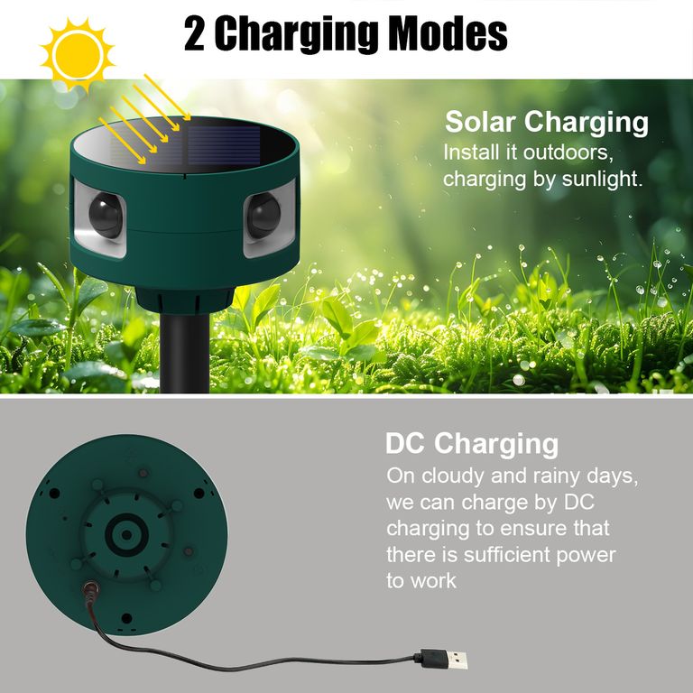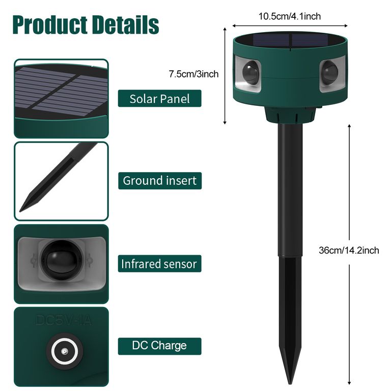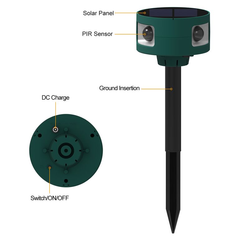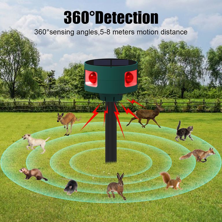 Ультразвуковой всепогодный отпугиватель животных и птиц на солнечных батареях R360 предназначен для отпугивания кошек, собак, грызунов, диких животных и птиц от мест, где их появление и присутствие нежелательно или опасно.