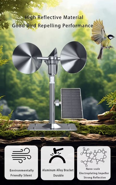 Отпугиватель для птиц зеркальный ветряной с солнечной панелью предназначен для гуманного и эффективного удаления птиц с открытых пространств. Его принцип действия основан на создании движущихся световых бликов, которые раздражают пернатых и заставляют их покинуть территорию. Вращение чаш производится за счет энергии световой панели, поэтому данный отпугиватель эффективен даже в безветряную погоду.
