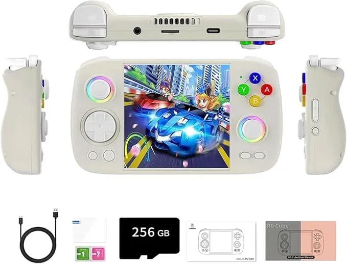 ANBERNIC RG СUBE имеет 8 ГБ оперативной памяти LPDDR4x и 128 ГБ внутренней памяти с поддержкой карт памяти TF до 2 ТБ..В комплекте TF- карта на 256 Гб c более,чем 8700 закаченными играми.
