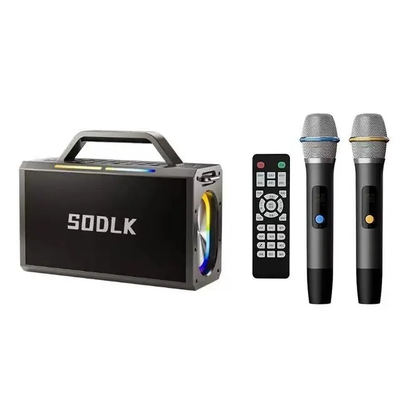 Караоке- система SODLK S1115 200W BLUETOOTH с двумя беспроводными микрофонами, аккумулятором 24000mAh и пультом дистанционного управления—одна из самых мощных переносных пылевлагозащищенных акустических систем. Она имеет 4 динамика ( 2*60W и 2*40W).