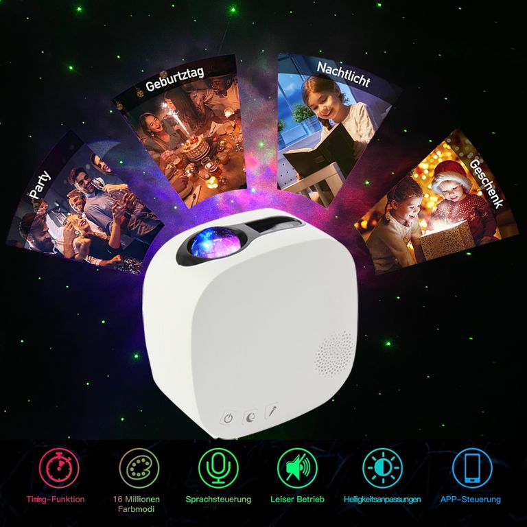 Разнообразие цветов в сочетании с динамической проекцией ночного неба ( с возможностью переключения скорости воспроизведения) создаст непринужденную, романтическую, красочную атмосферу.