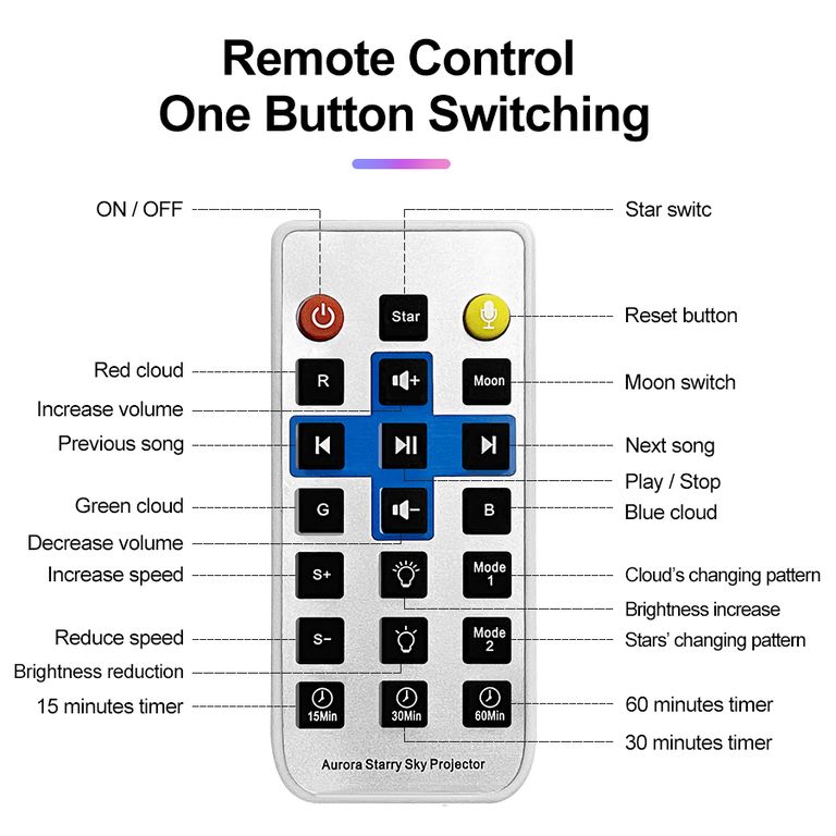 Также, на пульте есть таймер, где можно установить отключение “Звездного неба” через 15 мин, 30 или 60 минут. Если проектором никто не управляет, он сам отключается через 2 часа.