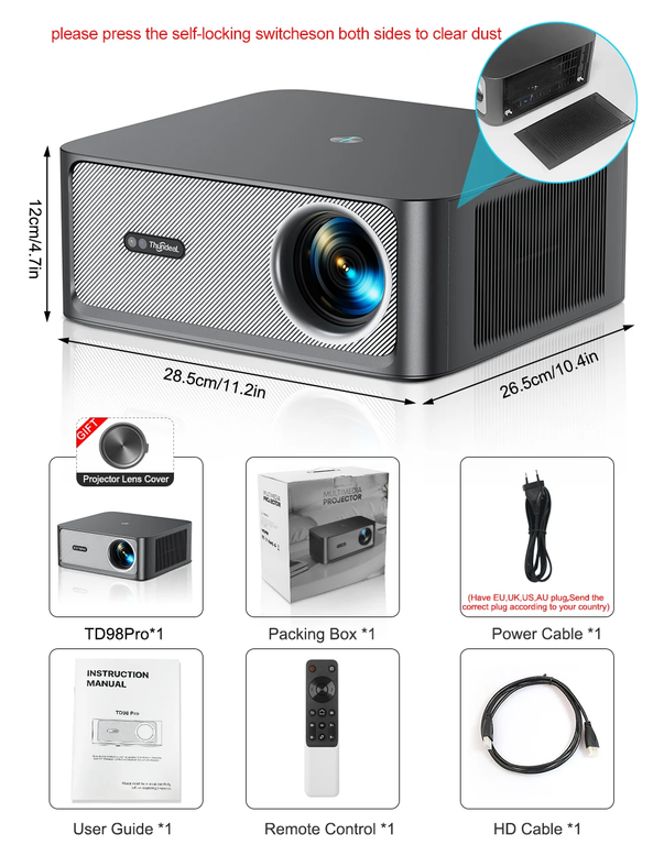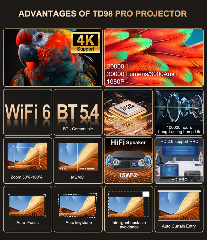 Проектор Thundeal TD98 Pro со встроенным Андроид 11.0 - это новый аппарат от известного бренда с яркостью 3000 ANSI (30000 люменов), контрастностью 26000:1 и родным разрешением Full HD с поддержкой 4K.