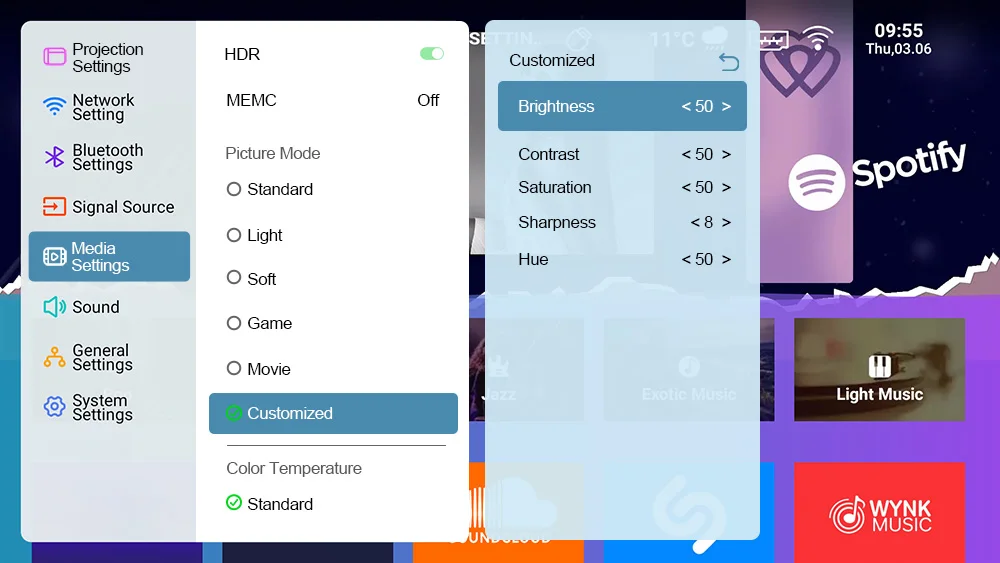 Проектор имеет настройку яркости, контрастности, четкости изображения, насыщенности и оттенка цвета прямо из Главного Меню.