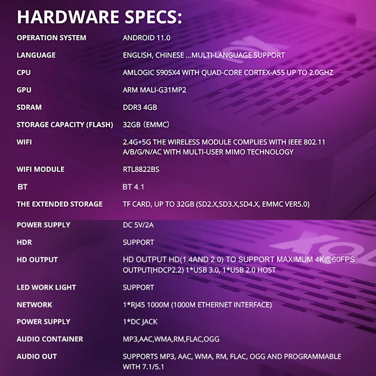 TOX3 4/32Gb– мощная ТВ приставка с процессором Amlogic S905X4, обеспечивающим прирост производительности примерно на 40% по сравнению с предыдущей моделью TOX1, графическим процессором Mali G31, 4Гб оперативной памяти и 32Гб встроенной. Устройство отличается внешней антенной для стабильной работы Wi-Fi, продуманной пассивной системой охлаждения и хорошо проработанной оболочкой операционной системы Android 11.0 с Root доступом, предустановленным Samba сервером и автоматической подстройкой частоты развертки под формат видео.