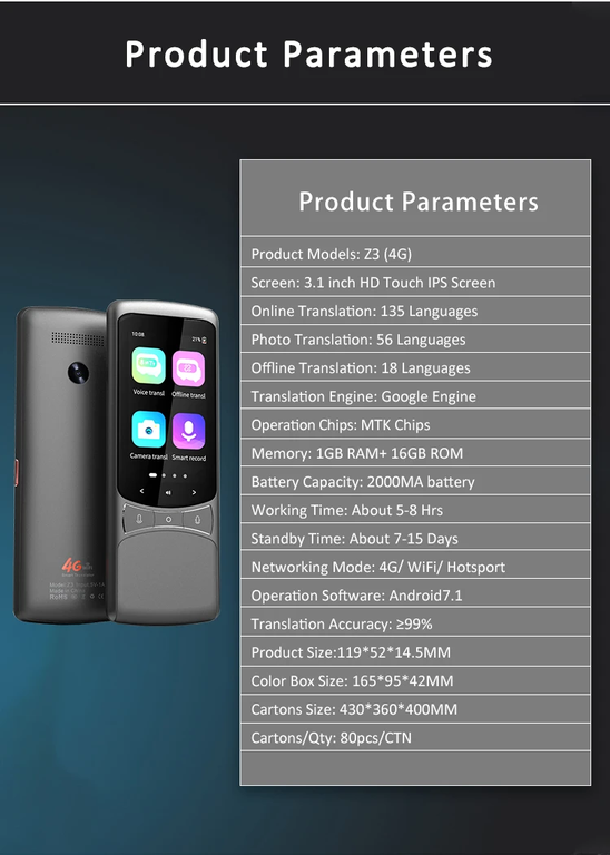 Умный голосовой переводчик 4G TRANSLATOR Z3 — это современное устройство, которое позволяет переводить на 135 языка. Также он имеет возможность автономного перевода ( Offline) на 20 языков, 14 из которых делают перевод с точностью 95%. Это традиционный китайский, испанский, русский, французский, немецкий, английский (Великобритания), японский, корейский, английский (США), китайский (упрощённый), вьетнамский, арабский, португальский, тайский. 6 языков Offline с точностью 70%: голландский, итальянский, кантонский, тайваньский, хинди, индонезийский.