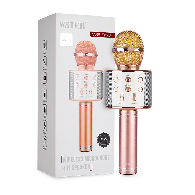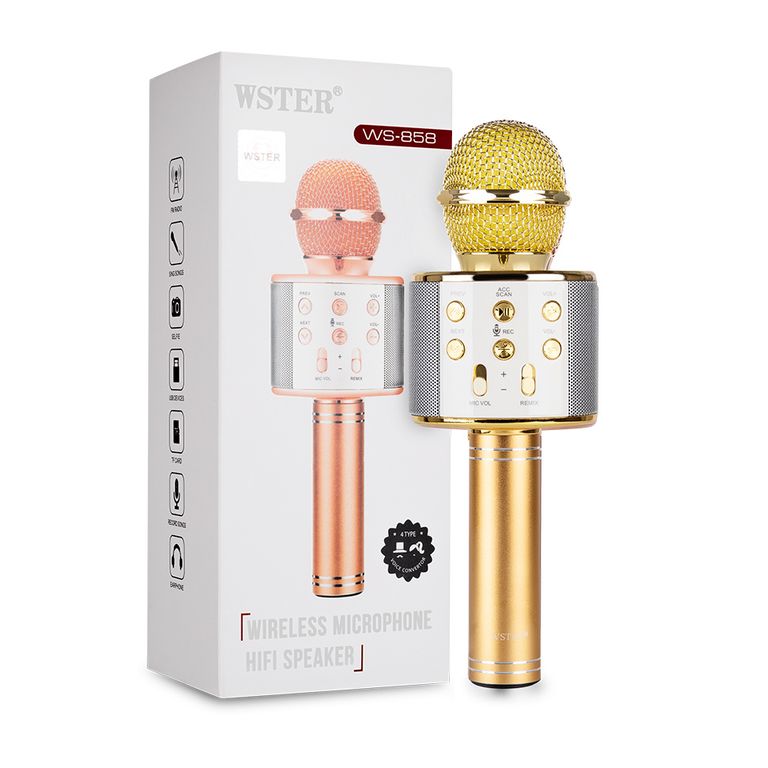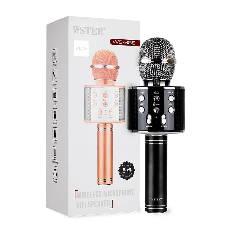 Микрофон WSTER WS-858 ОРИГИНАЛЬНЫЙ( а не копия!) - это просто ЧУДО для семейных праздников,вечеринок друзей и небольших мероприятий! Вы соединяете микрофон по Bluetooth со смартфоном или планшетом(где находите караоке в YOUTUBE и других приложениях) или вставляете флешку с “минусовкой” и Ваше событие превращается в настоящий праздник!