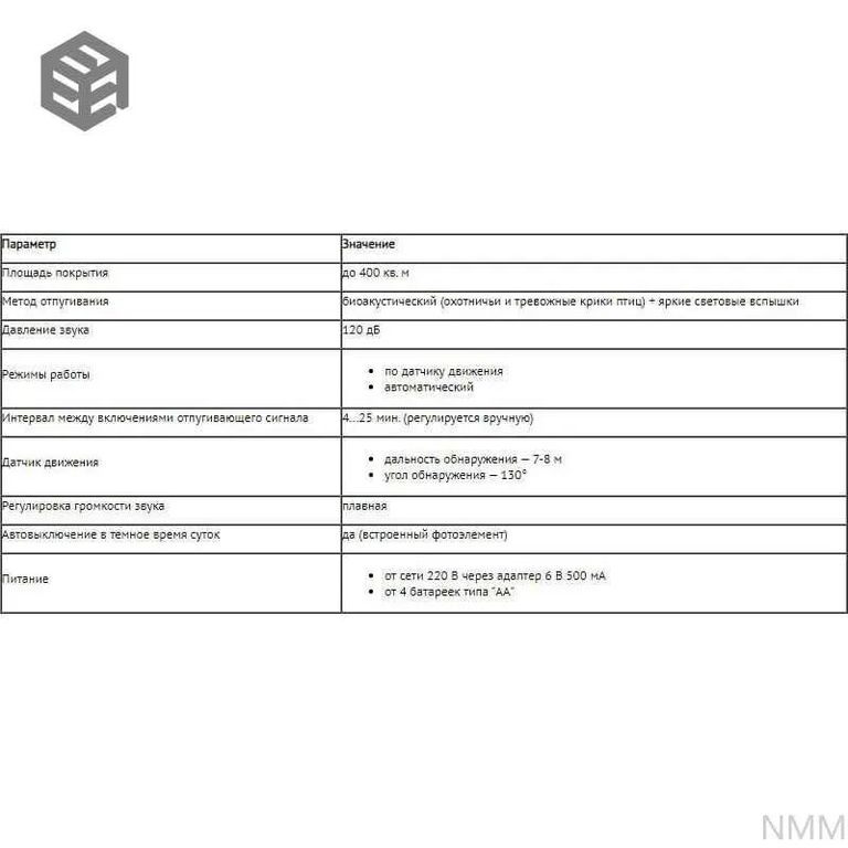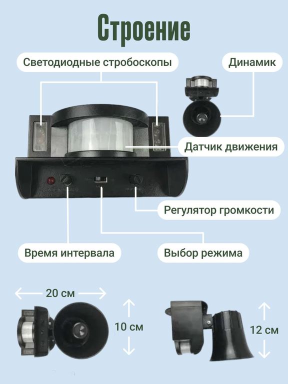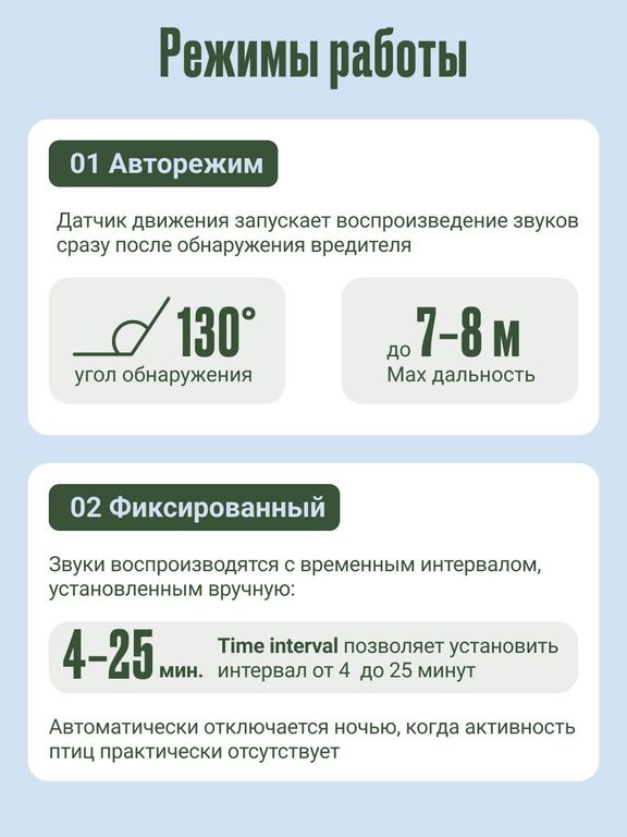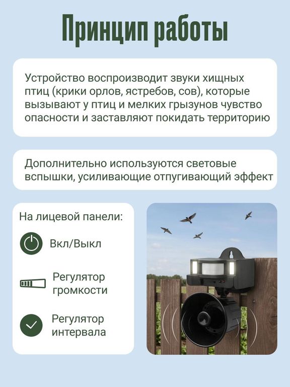 Устройство воспроизводит звуки хищных птиц (крики орлов, ястребов и сов), которые вызывают у птиц и мелких грызунов чувство опасности и заставляют покидать территорию. Дополнительно используются световые вспышки, усиливающие отпугивающий эффект.