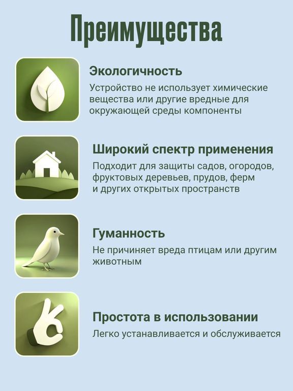 Биоакустический отпугиватель ZN-108 — это эффективное устройство для защиты дачных участков, садов, игровых площадок, автостоянок и других территорий от птиц и мелких вредителей, таких как грызуны, кролики и белки. Его ключевое преимущество — отпугивание без причинения вреда животным, что делает устройство гуманным и экологичным.