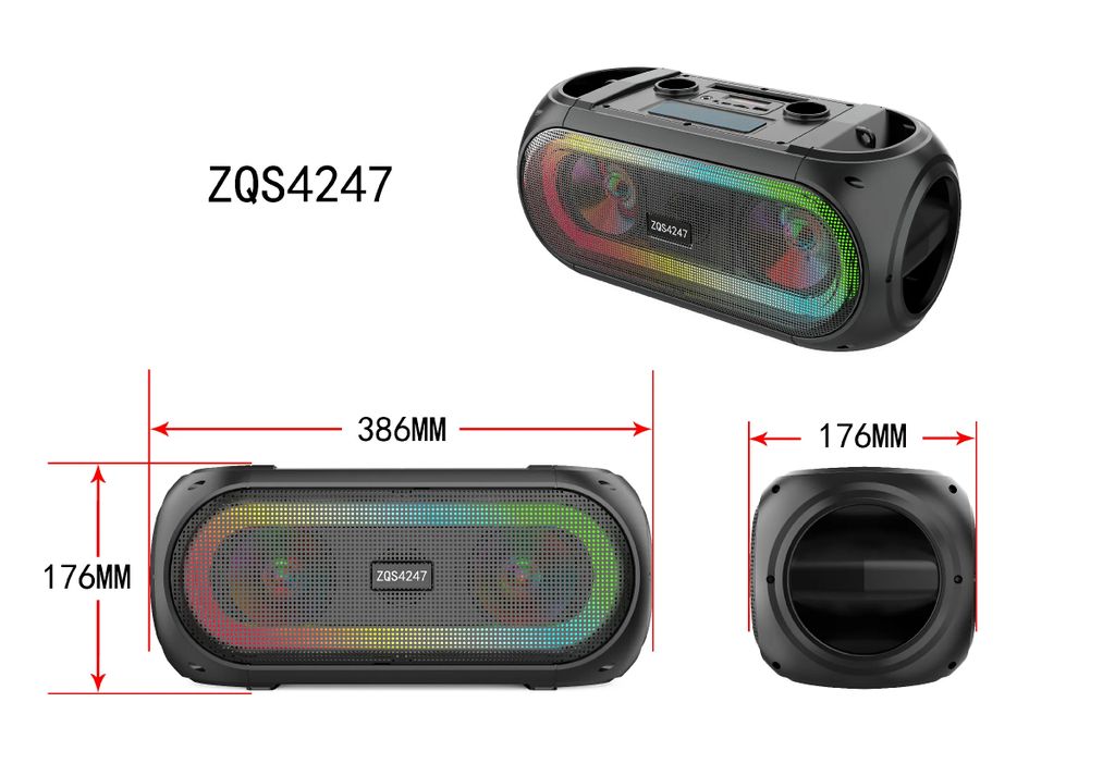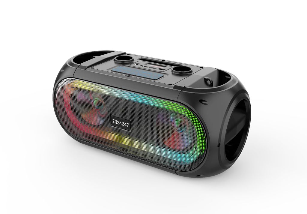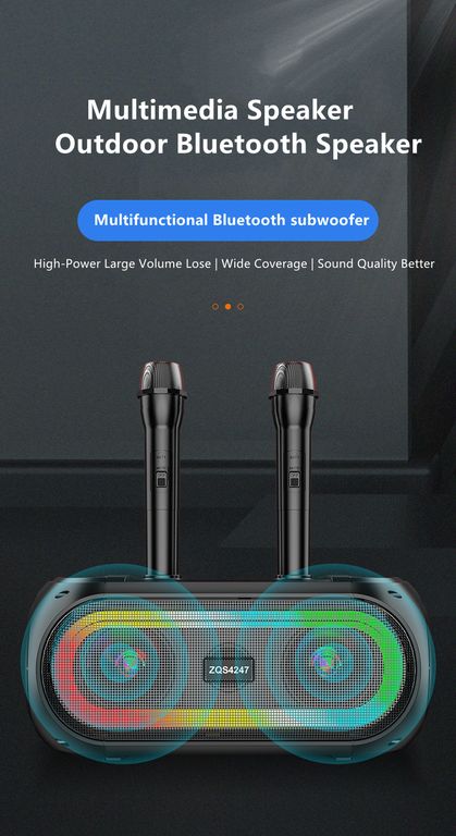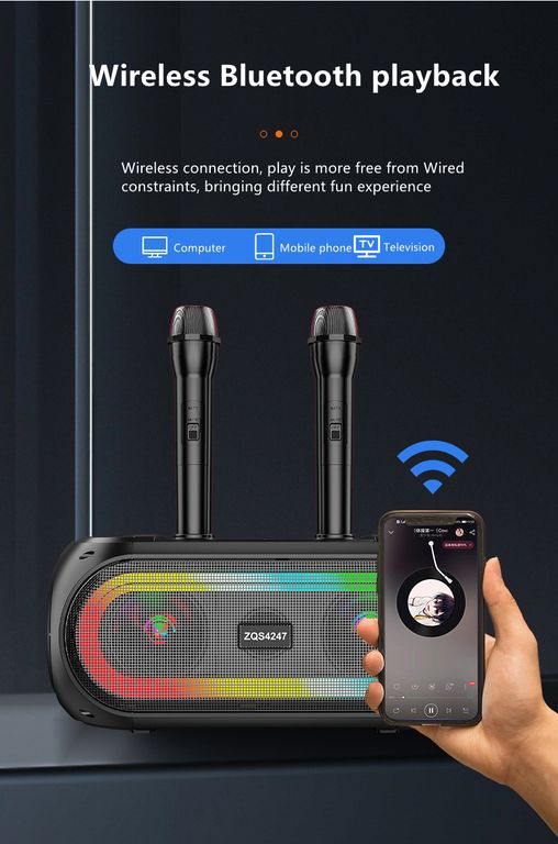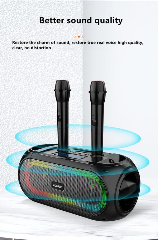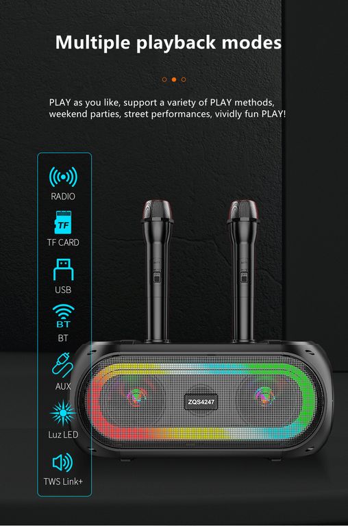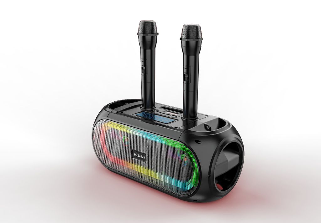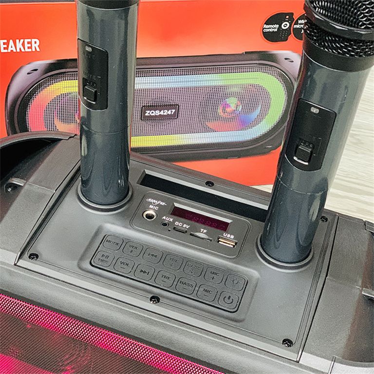 Домашняя беспроводная bluetooth караоке система ZQS4247 25W с двумя микрофонами идеальна для любой караоке-вечеринки, а также отлично подходит в качестве домашнего кинотеатра или просто мощной bluetooth колонки. Наличие тюнера, USB входа, слота для TF-карты (32 Gb) и разъема для дополнительного (третьего) микрофона делают эту систему абсолютно универсальной.